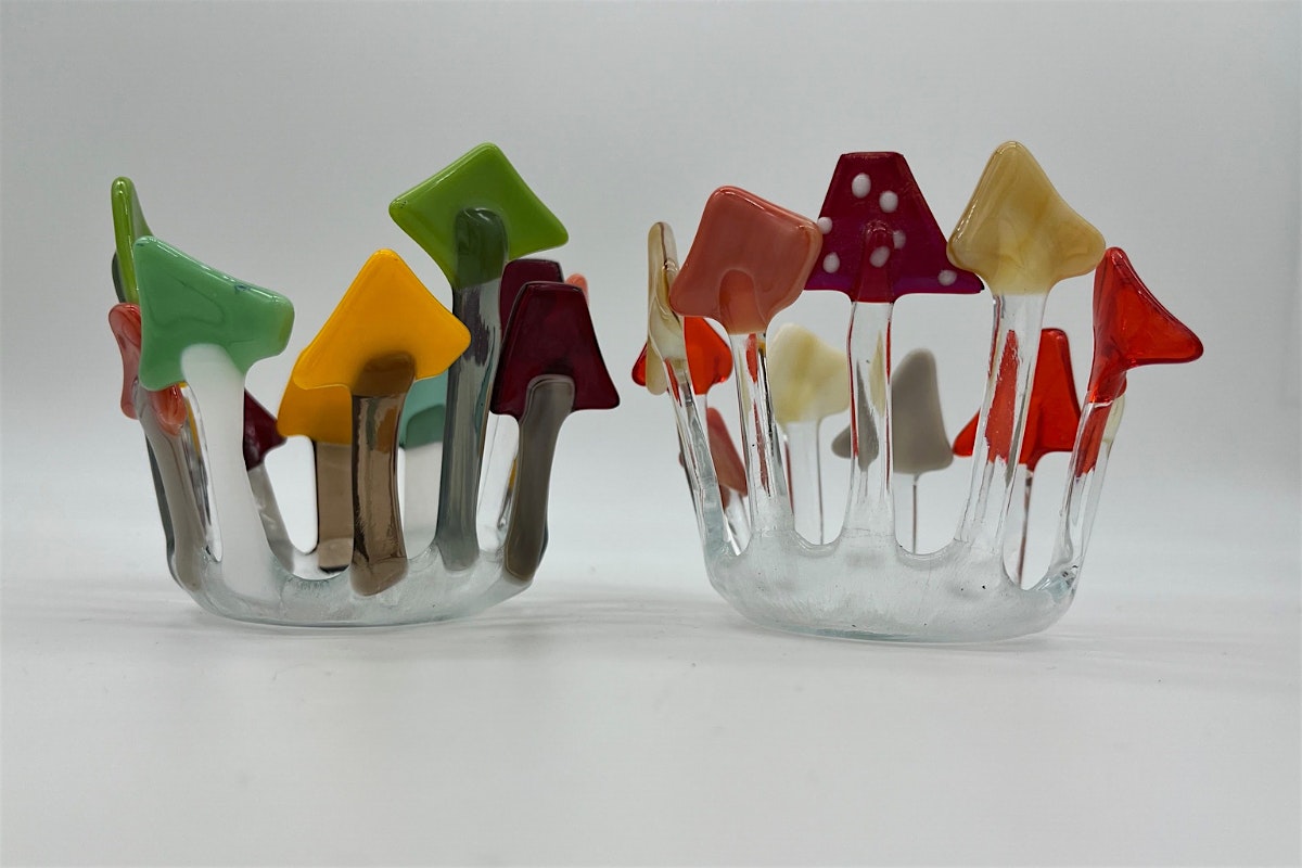 Design and create a beautiful glass tea-light holder! Imagine a small grove of trees or a crop of mushrooms with a small tealight inside. Under the guidance of Fused Glass …